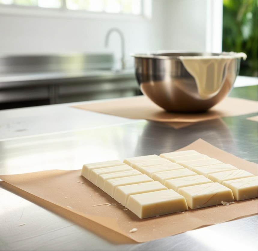Our premium organic cacao is carefully sourced from the Tarapoto region in Peru, where it is organically grown in its natural environment. The cacao fruit is opened and the pulp is removed to get the cacao beans, which are then fermented for 6-7 days, washed, and sun-dried for 3-4 days. Once dried, the beans are crushed to create cacao nibs. These are then ground into cacao paste (cacao liquor) and pressed to separate the pure cacao butter, which makes up around 50% of the cacao paste. The resulting cacao butter is a creamy, white-yellowish color and has a delicious cacao aroma.
